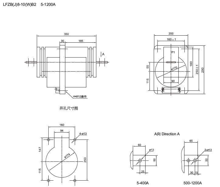 三、LFZBJ8-10A2、LFZB8-10B2穿墻式電流互感器安裝尺寸