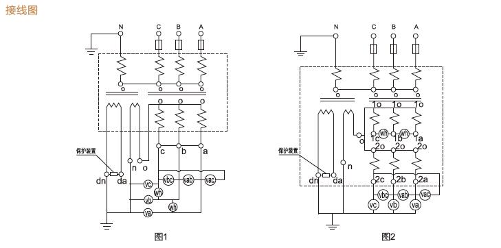 2、一次N點直接接地,二次接地監察繞組為(da、dn)接繼電器或作微機監控使用,本產品不允許重復接入一次消諧裝置及二次微機消諧裝置,否則會燒毀PT。