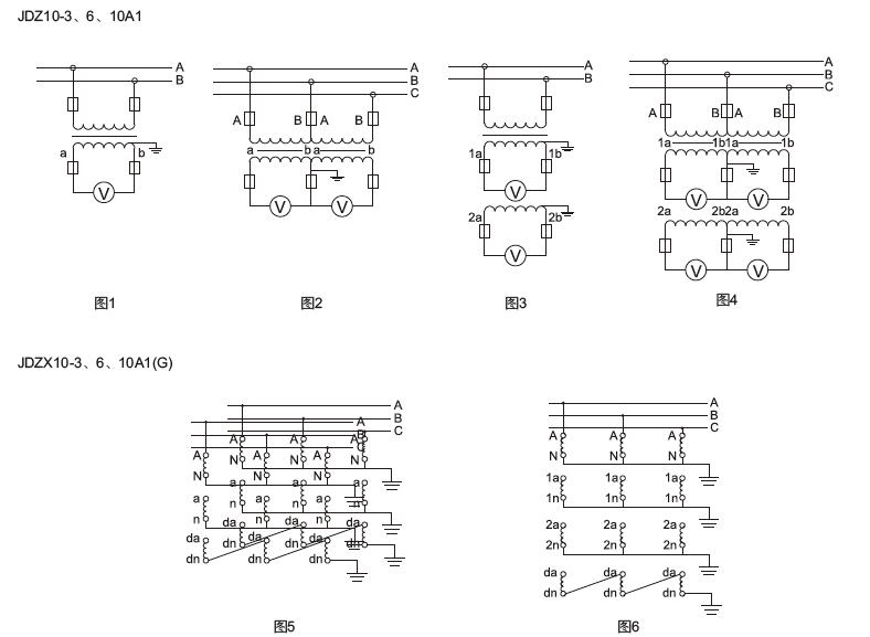 四、JDZ10-3A1(G)、JDZ10-6A1(G)、JDZ10-10A1(G)電壓互感器接線圖